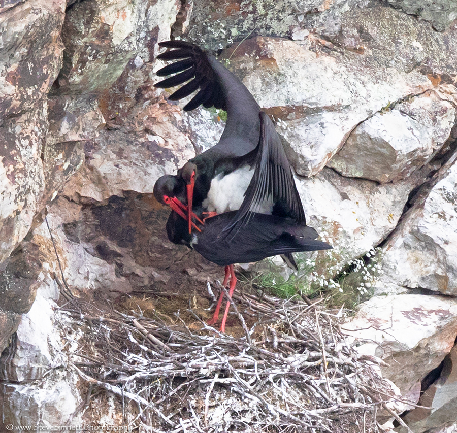 Black Storks at nest copulating